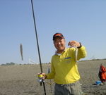 肩の痛みがどうやら去ったらしい。完治、完治と何回云ったろう?・・多分、ここ数日続いている静けさが釣り後にも続くのであれば、完治は本物になるかもしれない。 昨夕は、明日もう一日だけ釣りを休もうとしていたのだが、沢辺さんの原海岸に行きませんか?との誘いに、二の句を告げず賛同し同行させてもらった!! 午前3時原海岸に向け出発。こんなに早起きし出立するのは何日ぶりだろう・・。やはり健康でなければ!! 第1投は午前4時40分。5色に投げゆっくりとしたサビきに、ガッツン!と来た。・・・期待した通りの25センチの大物だった。 痛めた肩のぶり返しを避けるため、竿は、柔らかい27号の振出竿・・。仕掛けは、25号の「ウッドガン・スリム」に「W・スライド・テンビン」。それに7号の3本バリ。エサは東京スナメ(チロリ)だった。 やはり釣りは楽しい!! キスのアタリは何とも言えぬ快感だった。・・一瞬にして肩痛治療の苦労が消し飛んだ。 場所を37番から27番に移動する。・・・そこでは、17センチが2色でアタッたが後が続かなかった。 茅ケ崎から来られた佐々森さんの話では、到着した4時ころから、3人がそれぞれ23センチ、24せんち、25センチと、仲良く1尾ずつ仕留めたそうだ。 ・・・まだまだ期待できる原海岸だ。 10時ころ、静浦湾の志下海岸(御用邸公園下)に移動する。ここでは15尾ほどを釣ったが、それこそ距離はチョイ投げでの1色だった。・・・15〜18センチの中小のアタリを十分楽しむことが出来た。 ・・・ここは梅雨明けまでが盛期!! 帰宅した今、肩の痛みは無く張りを感じる程度だ。 どうやら、これで肩痛からも解放されそうだ。明朝起きて、違和感さえなければ、再び平塚海岸のキス釣りに励みたいと思っている。 28日(月):今朝ゆっくり起きて、20号の振出竿をもって平塚海岸に行ってみた。風が出始めすぐに止めたが、先行していた平井さんが23センチくらいのをバッカンに泳がせていた。 肩の痛みは、首から肩にかけて張りを感じるが痛みは無い。無理はできないが、やっと人並みに投げ釣りに復帰できそうである。