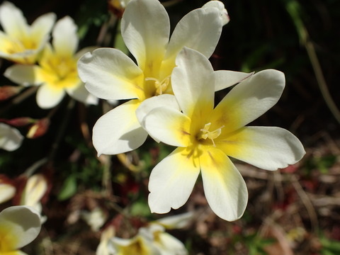 これは珍しい品種で、まだよく普及して居ない「トリトニアクロカタ」と言う、南アフリカ原産の花である。恐らく輸入された園芸品種の原種であるのではないかと言うことだった。・・・その後、植物図鑑などで調べた結果、「耐寒性で乾燥にも強く、球根で殖やせる」と判明。何時だったか、NHKの趣味の園芸HPに写真投稿をしたこともある。