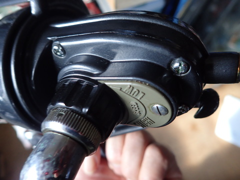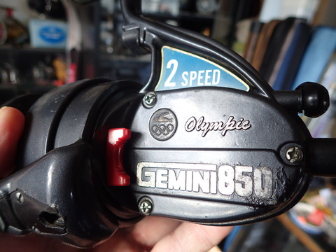 見せて戴いた中で、一番に引かれたもの・・・。これまで見たことも無く、話だけで終わっていたアルものである。今日始めて見るそれは、「オリムピック社」製の「ジェミニ850」という大型のスピニングリール。特徴は、巻き取り速度が2段切り替え出来ることである。