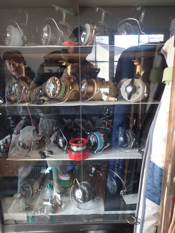 リールは、木リールに始まって、この世に営まれたあらゆる釣り具メーカーから出された大小のスピニングリールが、これも数百台?はあろうか。・・手付かずの、箱入りも何十台もある。更に、水箱(今のクーラーボックス)や投げ釣りに関する懐かしい時代の書籍も多数あった。