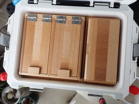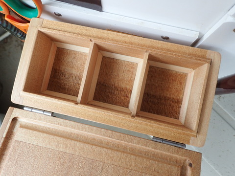 更に、付けエサ用小箱の方も、間仕切り板の厚さを5ミリから薄い3ミリに変更して、3間でも十分な広さが確保されていた。これで3種のエサを、或いは2種のエサ+木粉専用として使えることになった。