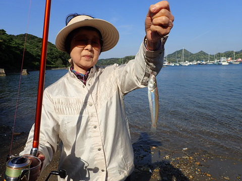 エサを付け、投げてやるのは小生・・。女房殿は、ただ、サオを持ってサビキながら、アタリを楽しみ、暴れるキスの感触を味わいながら取り込むだけ・・・。