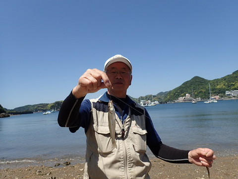 3人各1の釣果です! 今日は潮の変わり目である若潮、ダメはもともとで出かけてみた。ウネリっ気もあって良くない・・・。 広くは無い海岸だが、探ってみた。アタリは無く、フグの猛襲・・・。どれくらいハリを消耗したか・・・。 遠方から同行の和田兄さんが手招きする。・・良型を釣ったようだ・・。 早速場所替えで傍に行って見た。・・25センチほどの大きな奴だった。 喰ったエサは最近見かける赤い青イソメだったと言う。3本バリにその柔らかいエサを付け、3色に投げてみた・・。 その途端、ガッツン!!の大きなア…