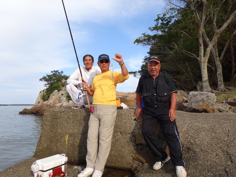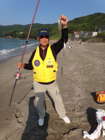 脇本海岸での2日目もほぼ同様な状況で、特に堀川宗雄さん、田村幸男さんが良型を連釣りしていた。実は、気が付かなかったのだが少し離れた海岸右手に入った弥園順次さんが、なんと23センチを頭に良型を10数尾釣っていたのである。