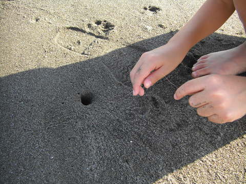 子供の頃は巣穴を見つけると乾いた白い砂を穴に流し込み、湿った砂にはっきりと見える白い砂をたどって手で掘り進むと、やがてモゾモゾと動くカニにたどり着く・・・そんな遊びを楽みました。