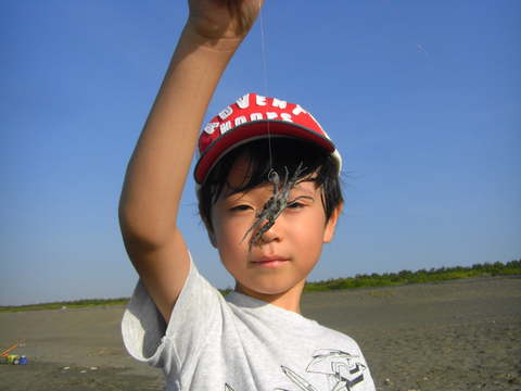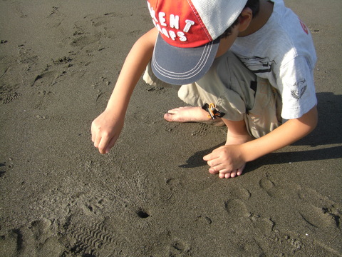 ところで、今日は童心に帰って砂ガニと戯れようと、小バリ仕掛けを持参した。釣友佐藤正美さんの子息優太君を誘って、さっそく砂穴に仕掛けを落とし込み、釣り?開始!!