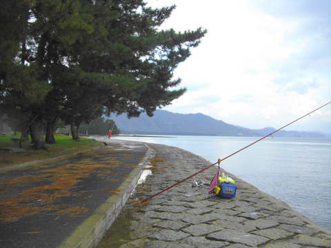 行った先は、宮津湾の最奥に位置する宮津市の西宮津公園前。背後は松林で、釣り座は整備された低い護岸からである。雨模様ではあったが無風状態で、波は無く静かである。・・しかし、数投したものの18センチクラスが数尾だけだった。