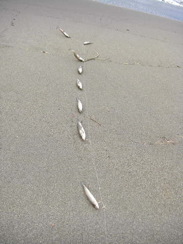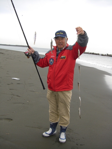 小生の釣り方だが、多点バリで波打ち際を釣る場合、オモリは重めの25〜27号とする。仕掛けは長めの3メートル以上とする。これは、キスの1尾1尾が、しっかりとハリ掛りし、長い仕掛けと重いオモリによって食いついた魚が暴れられないから、絡みも無くなるのだ。ただ、サビき方は慎重に、何時も張り気味にする。最後の取り込みは、引き波に抵抗して引っ張らないことだ。