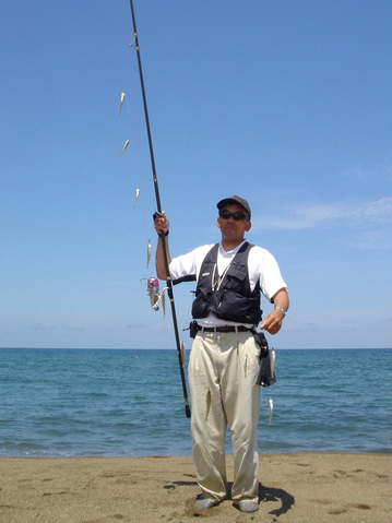 三里浜海岸、ここは多くの全国規模の大会が開かれるシロギスの宝庫である。ここでも、大小を問わず一投目から盛んに釣れ続いた。西田さんなど、得意の連釣り技で10点バリのパーフェクトを見せていた。我輩は小ギスはすべてリリースし20センチ以上のモノだけをクーラーに納めたが、その数は20尾を超えていた。北陸まで来てよかった・・楽しい釣りの一時を、本当に、充分堪能したのである。
