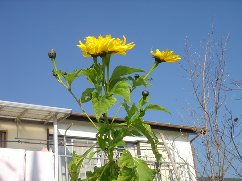 英名は Mexican sunflower 、別名はメキシコヒマワリ。分類はキク科メキシコヒマワリ属。原産地はメキシコ〜中米。多年草で草丈2〜4?になる。葉は楕円形で切れ込みがある。花期は晩秋の11月から〜12月。花は15cm位になり、明るい黄色。古代中国では非常に高貴なものとして扱われ、ほてり止めのほか、黄疸、肝炎、膀胱炎などの治療薬として用いられており、メキシコでは皮膚感染症の治療薬として利用されている。近年の科学的研究で抗炎症作用や抗がん活性も指摘されており、健康食品としても注目されている。・・そうだ。
