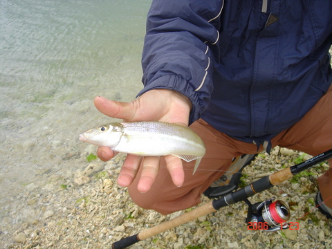 宜保さんは、ルアー竿で軽いオモリを付けて流れに乗せながら釣りはじめた。私は逆に、流されないようにオモリを23号と重くした。村越さんのは、確か18号だったと思う。そこで又、差がついてしまったのである。村越さんはゆっくり流しながら、26センチ迄の良型を3尾も釣っている。宜保さんは1尾、私は0尾である。
