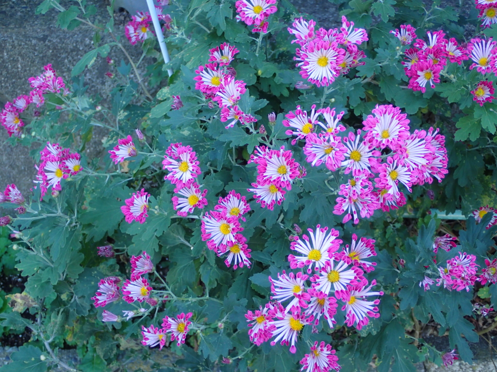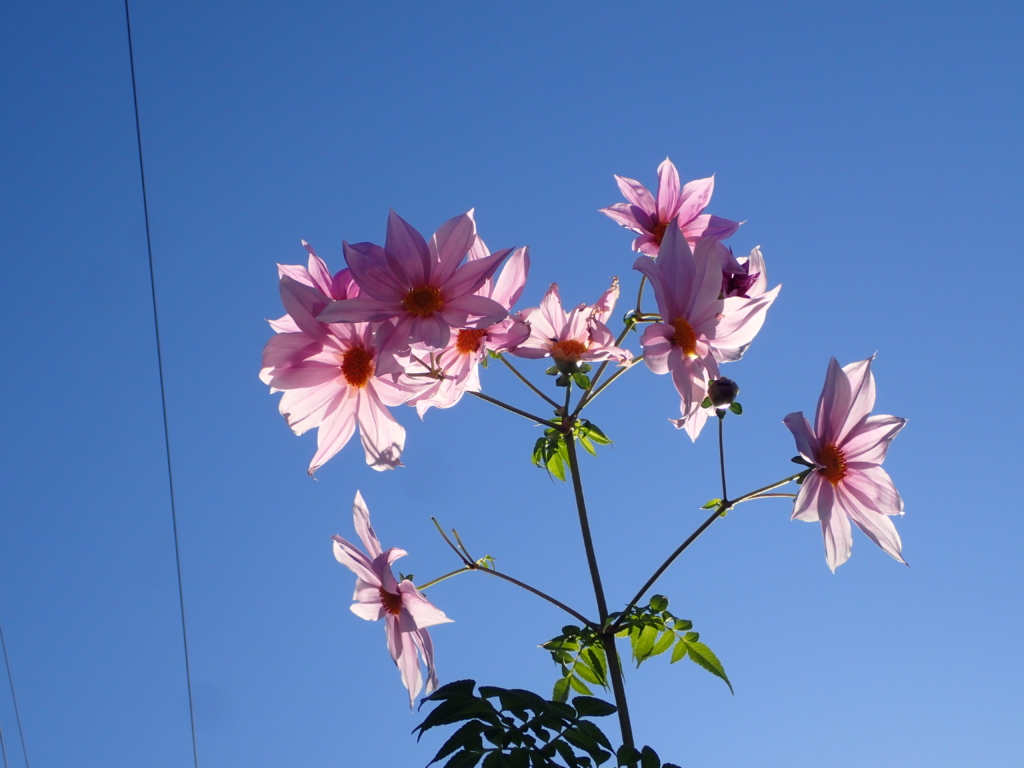 放ったらかしにされていた日陰の皇帝ダリアが、天高く誇らしげに咲いていた。・・・空を見上げることが少なくなったこの頃、気付くのが遅かったのだ。傍に、タイワン椿と菊が咲いていた。自然の営みは何とも素晴らしい!!