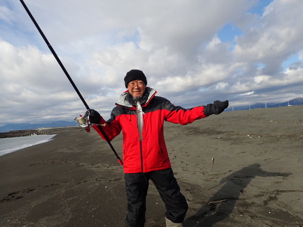 新春2日、相模川馬入河口で初釣りを楽しんできた。新年早々からお凸は嫌だ!・・で、小生は浜中央部に陣取った1投目から、3色半でピンギスが付いてきた。アタリは小さく決して面白く無かったものの、今年の初物だし、これで顔も見れた。少し遅れて来たジャンボ二宮さん、ゆっくり支度を整え第一投・・。間もなく、にこやかな顔に!! 波間から顔を出したのは、実に20センチを超えるヒネとピンの一荷だった!