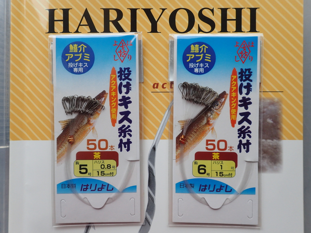 ここに紹介するのは、この「鱚介アブミ」の糸付き、言うなれば「枝ハリス」でハリの大きさは5号と6号の2種類です。ハリスは、硬めで張りのある高級なナイロン「アクアキング」、5号には0.8号、6号には1.0号が使われています。長さは、ともに15センチと長めで、多様な仕掛けつくりに適し、価格は1パック50本入りで800円です。