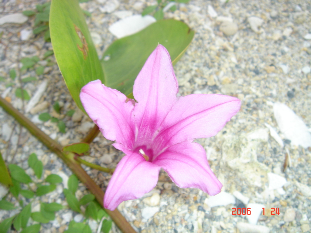 この花は、海岸のゴロタ石の間から這い出した硬い蔓性の植物で「グンバイヒルガオ」と言うようです。